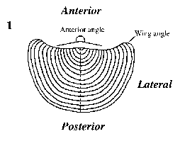 The orientation of these structures would be the same whether they were interpreted as crustacean carapaces or cephalopod mandibles. In each case, the rostrum or apex (center of the concentric ornamentation) is anterior; the hinged region is medial. For detailed terminology, see Figure 1. The morphological terms used here are based on those defined by Clarke (1962) for the description of coleoid cephalopod mandibles. The anterior angle is here defined as the angle of the anterior margin of the flattened fossil; convex if the rostrum is emergent, concave if it is reentrant.